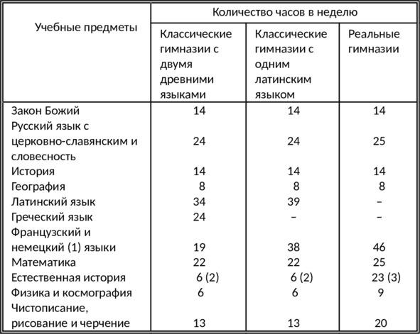 Примечания: 1. В гимназиях с обоими древними языками или французский, или немецкий. В остальных оба. 2. Только в трех младших классах. 3. Сюда же входила и химия.