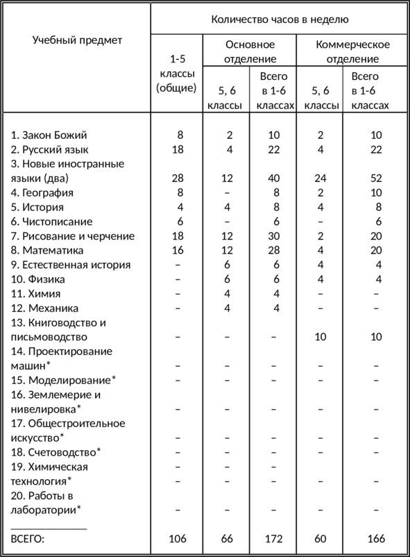 *Данные учебные предметы изучались на техническом отделении реальных гимназий.