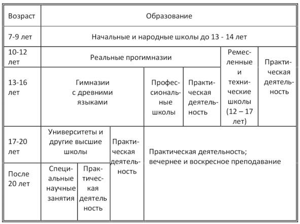 Однако эта задача виделась педагогу перспективной, реализовать которую можно лишь в отдаленном будущем, когда в обществе созреют необходимые для этого материальные и культурные предпосылки. А пока важно было устранить тупиковость сословной школы, ликвидировать необоснованную многопредметность обучения, внедрить в школьную практику принципы естественнонаучного, реального образования [2].