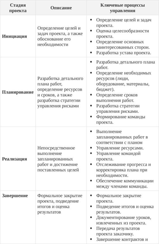 Таблица 1. Стадии проекта и соответствующие им группы процессов управления