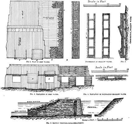The canal was formed by "fencing in" a portion of the river-bed by an embankment built about a hundred feet out from the north shore and deepening the intervening space where necessary. There are two locks--one placed a little above the foot of the rapid (see map), and the other at the end of the dam. Wooden piers are built at the upper and lower ends--the former being 800 ft. long, and the latter 300 ft; both are about 29 ft. high and 35 ft. wide.