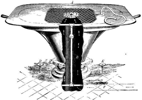 The strainer is quite large, with a downward draught which passes through a large flue, as shown by letter, F, connected above the water seal of the waste trap and trunk of the table to the chimney of the boiler house, as indicated by the arrows, carrying down all offensive odors from the body, thereby preventing the permeating of the air in the room.