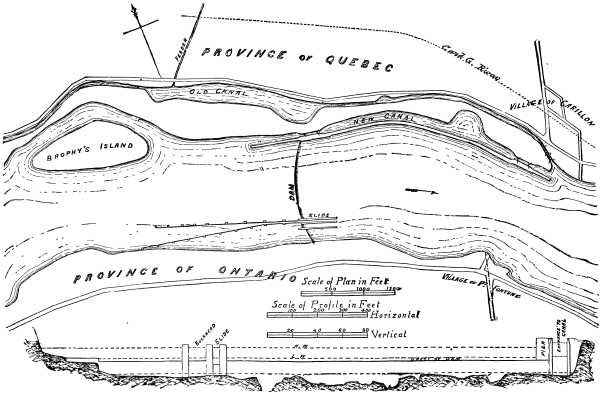 The natural navigation of the Ottawa River from the head of the Island of Montreal to Ottawa City--a distance of nearly a hundred miles--is interrupted between the villages of Carillon and Grenville which are thirteen miles apart by three rapids, known as the Carillon, Chûte à Blondeau, and Longue Sault Rapids, which are in that order from east to west. The Carillon Rapid is two miles long and has, or had, a fall of 10 feet the Chûte à Blondeau a quarter of a mile with a fall of 4 feet and the Longue Sault six miles and a fall of 46 feet. Between the Carillon and Chûte à Blondeau there is or was a slack water reach of three and a half miles, and between the latter and the foot of the Longue Sault a similar reach of one and a quarter miles.