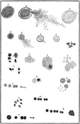 Plate IX.--Large group of malaria plants, Gemiasma verdans, collected at 165th Street, east of 10th Avenue, New York, in October, 1881, by Dr. Ephraim Cutter, and projected by him with a solar microscope. Dr. Cuzner--the artist--outlined the group on the screen and made the finished drawing from the sketch. He well preserved the grouping and relative sizes. The pond hole whence they came was drained in the spring of 1882, and in August was covered with coarse grass and weeds. No plants were found there in satisfactory quantity, but those figured on Plate VIII. were found half a mile beyond. This shows how draining removes the malaria plants.