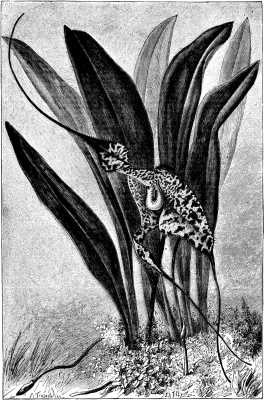Of all the cultivated Masdevallias, none are so weirdly strange and fascinating as is the species M. chimæra, which is so well illustrated in the accompany engraving. This singular plant was discovered by Benedict Roezl, and about 1872 or 1873 I remember M. Lucien Linden calling upon me one day, and among other rarities showing me a dried flower of this species. I remember I took up a pen and rapidly made a sketch of the flower, which soon after appeared (1873, p. 3) in The Florist, and was perhaps the first published figure of the plant. It was named by Professor Reichenbach, who could find for it no better name than that of the mythical monster Chimæra, than which, as an old historian tells us, no stranger bogy ever came out of the earth's inside. Our engraving shows the plant about natural size, and indicates the form and local coloring pretty accurately. The ground color is yellowish, blotched with lurid brownish crimson, the long pendent tails being blood color, and the interior of the sepals are almost shaggy. The spectral appearance of the flower is considerably heightened by the smooth, white, slipper-like lip, which contrasts so forcibly in color and texture with the lurid shagginess around it. Sir J. D. Hooker, in describing this species in the Botanical Magazine, t. 6, 152, says that the aspect of the curved scape as it bears aloft its buds and hairy flowers is very suggestive of the head and body of a viper about to strike. Dr. Haughton, F.R.S., told me long ago that Darlingtonia californica always reminds him of a cobra when raised and puffed out in a rage, and certainly the likeness is a close one.