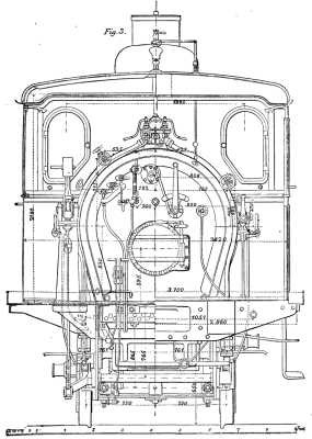 We give engravings of one of a type of eight-coupled locomotives constructed for service on the St. Gothard Railway by Herr T.A. Maffei, of Munich. As will be seen from our illustrations, the engine has outside cylinders, these being 20.48 in. in diameter, with 24 in. stroke, and as the diameter of the coupled wheels is 3 ft. 10 in., the tractive force which the engine is capable of exerting amounts to (20.48² x 24) / 46 = 218.4 lb. for each pound of effective pressure per square inch on the pistons. This is an enormous tractive force, as it would require but a mean effective pressure of 102½ lb. per square inch on the pistons to exert a pull of 10 tons. Inasmuch, however, as the engine weighs 44 tons empty and 51 tons in working order, and as all this weight is available for adhesion, this great cylinder power can be utilized. The cylinders are 6 ft. 10 in. apart from center to center, and they are well secured to the frames, as shown in Fig. 4. The frames are deep and heavy, being 1 3/8 in. thick, and they are stayed by a substantial box framing at the smokebox end, by a cast-iron footplate at the rear end, and by the intermediate plate stays shown. The axle box guides are all fitted with adjusting wedges. The axle bearings are all alike, all being 7.87 in. in diameter by 9.45 in. long. The axles are spaced at equal distances of 4 ft. 3.1 in. apart, the total wheel base being thus 12 ft. 9.3 in. In the case of the 1st, 2d, and 3d axles, the springs are arranged above the axle boxes in the ordinary way, those of the 2d and 3d axles being coupled by compensating beams. In the case of the trailing axle, however, a special arrangement is adopted. Thus, as will be seen on reference to the longitudinal section and plan (Figs. 1 and 2, first page), each trailing axle box receives its load through the horizontal arm of a strong bell-crank lever, the vertical arm of which extends downward and has its lower end coupled to the adjoining end of a strong transverse spring which is pivoted to a pair of transverse stays extending from frame to frame below the ash pan. This arrangement enables the spring for the trailing axle to be kept clear of the firebox, thus allowing the latter to extend the full width between the frames. The trailing wheels are fitted with a brake as shown.