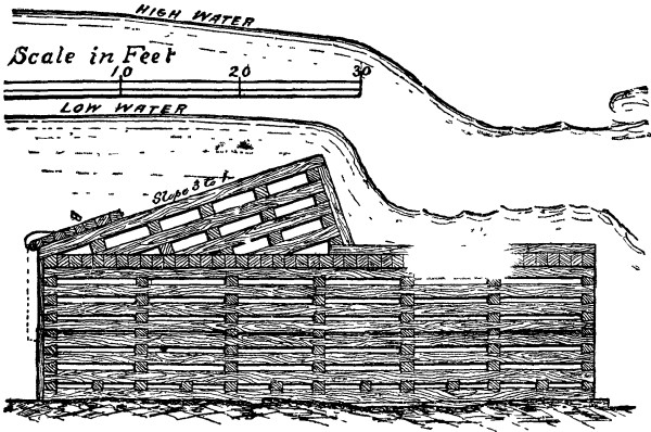On top of these sills and cribs there was then placed all across river a platform from 36 to 46 feet wide made up of sawed pine timber 12 in. X 12 in., each piece being securely bolted to its neighbor and to the sills and cribs below. It was also at intervals bolted through to the rock.