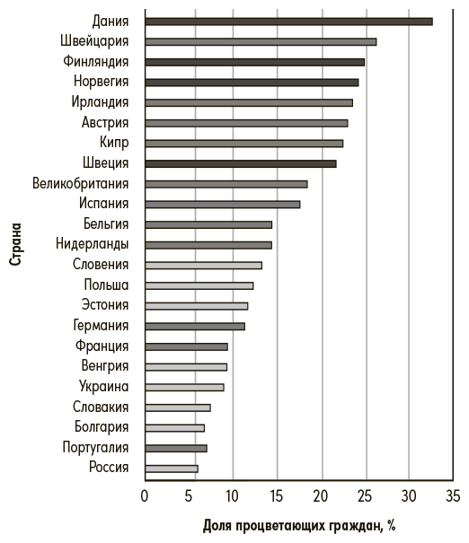 46. T. So and F. Huppert. What Percentage of People in Europe Are Flourishing and What Characterizes Them? (July 23, 2009). Retrieved October 19, 2009, https://www.isqols2009.istitutodeglinnocenti.it/Content_en/Huppert.pdf. Соу и Хапперт использовали данные последнего Европейского социологического исследования, включающего в себя модуль благополучия, чтобы измерить уровень процветания в выборке около 43 000 взрослых (от 16 лет) в 23 европейских странах. Они установили помимо страновых различий связь между более высоким уровнем процветания и более высоким уровнем образования, дохода, а также браком. Состояние здоровья также умеренно коррелирует с процветанием, хотя процветает лишь треть оценивающих свое здоровье как хорошее. Установлено, что процветание убывает с возрастом. Впрочем, это не линейная зависимость: фактически в некоторых странах (например, в Ирландии) самый высокий уровень процветания показывают жители старше 65 лет; самые низкие значения соответствуют среднему возрасту.