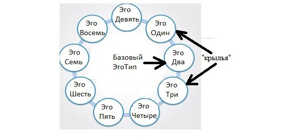 В личности человека проявлено примерно 60—70% основного эготипа и примерно 30—40% — соседнего типа. В нашей теории это называется «крыло». То есть к характерным проявлениям базового типа добавляются черты соседнего (по схеме) типа. И характер существенно меняется в зависимости от крыла. Например, ЭгоШесть с пятым крылом — молчаливые, погруженные в себя мыслители. В то время как ЭгоШесть с седьмым крылом — громкие, суетные, активные и позитивные. Но базовые проявления характера, а также переходы в стресс и позитив похожие.