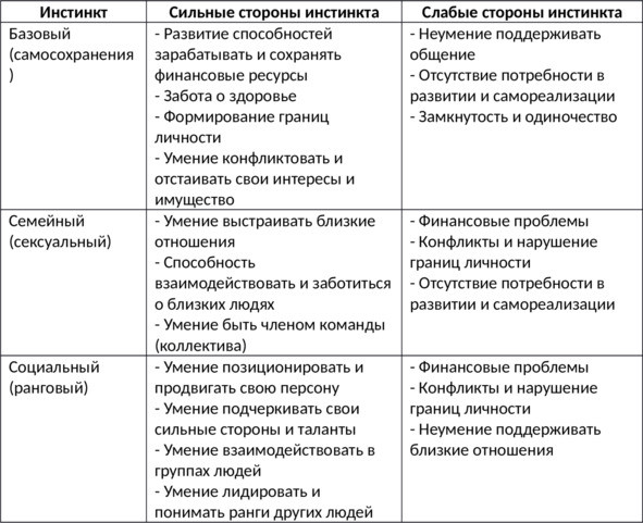 Все три инстинкта важны в жизни человека, и все их необходимо планомерно развивать. У каждого инстинкта есть свои сильные стороны и свои слабые стороны, их необходимо знать и учитывать в собственном развитии и в коммуникациях с другими людьми.