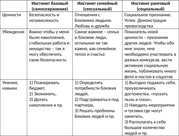 Ведущий инстинкт определяет ценности, убеждения, умения и навыки и отражается в моделях поведения.