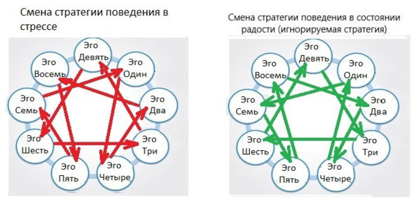 Есть определенные закономерности, ориентируясь на которые, также можно определить тип человека. Подробно об изменении стратегий поведения при переходе в стрессе и в позитиве написано в главах по каждому типу. И характерный переход в стрессе и в позитиве происходит по базовому типу. Например, ЭгоВосьмерка с девятым крылом в стрессе переходит по базовому типу в ЭгоПятерку. Влияние крыла на переход в стрессе или позитиве не происходит.