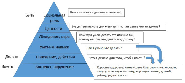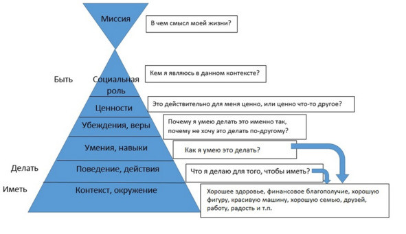 Пирамида логических уровней Роберта Дилтса основана на закономерности в осознании персонального жизненного опыта (побед, достижений, ошибок, проблем, потерь и т.д.). Каждый уровень данной пирамиды предназначен для информации определенного класса (информация для наших действий, наших навыков, убеждений, ценностей и социальных ролей). При осознании себя соблюдается определенный уровень классификации, и изменение осознания (инсайта) на более высоких уровнях всегда неизбежно влияет на более низкие уровни.