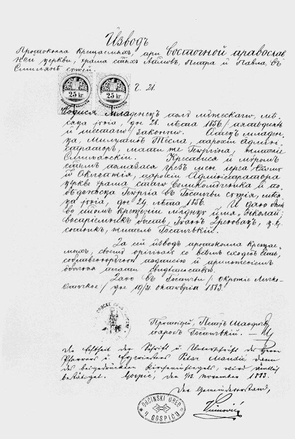 Свидетельство о крещении Николы Теслы