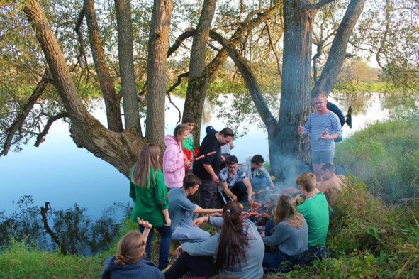 Члены Клуба Исторического Туризма в походе. Станислав Шурупов держит речь перед новообращенными. Фотограф Виталий Тарасенко