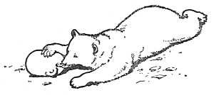 Another habit in which he has improved upon Mooween is his fishing. He knows how to flip fish out of water with his paw, as all bears do; but he has also learned how to attract them when they are not to be found on the shallows. Many times in the twilight I have found Mooweesuk sitting very still on a rock or gray log beside the pond or river, his soft colors and his stillness making him seem like part of the shore. Other naturalists and hunters have mentioned the same thing, and their testimony generally agrees in this: that Mooweesuk's eyes are half shut at such times, and his sensitive feelers, or whiskers, are playing on the surface of the water. The fish below, seeing this slight motion but not seeing the animal above, attracted either by curiosity or, more likely, by the thought of insects playing, rise to the surface and are snapped out by a sweep of Mooweesuk's paw.