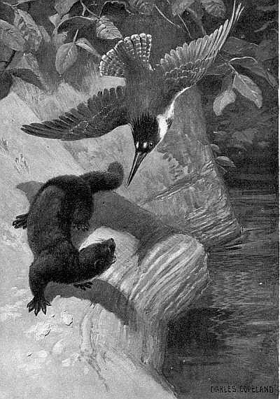 At the mouth of the den she stepped aside, and the young filed in out of sight one after another. The mother looked and listened for a moment, then scuttled away through the woods as a clear tremulous whinny came floating in through the twilight. A moment later I saw her on the shore of the pond with a larger coon, her mate probably, who had been asleep in another hollow tree by himself; and the two went off along the shore frogging and fishing together.