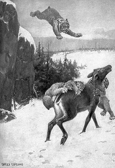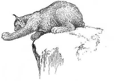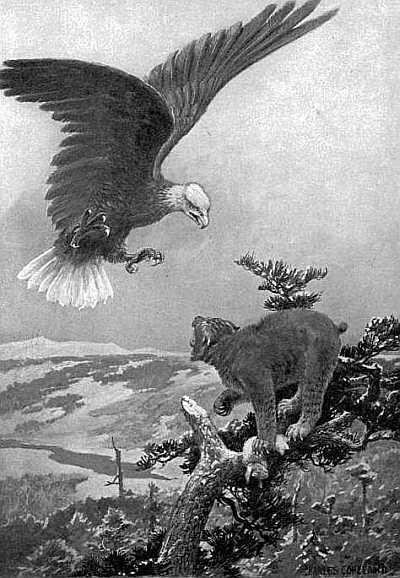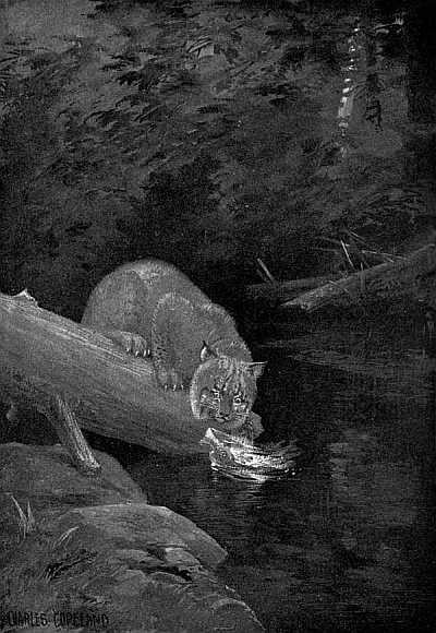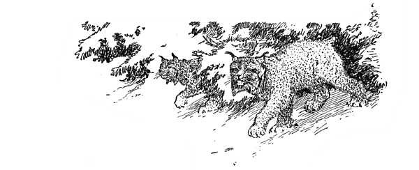 Once, when watching for days under a fish-hawk's nest to see the animals that came in shyly to eat the scraps that the little fish-hawks cast out when their hunger was satisfied, this cat habit was strikingly manifest. Other animals would come in and quietly eat what they found and slip away again; but the cats would seize on a morsel with flashing eyes, as if defying all law and order, and would either growl horribly as they ate or else would slink away guiltily and, as I found out by following, would climb the biggest tree at hand and eat the morsel in the highest crotch that gave a foothold. And once, on the Maine coast in November, I saw a fierce battle in the tree-tops where a wildcat crouched, snarling like twenty fiends, while a big eagle whirled and swooped over him, trying to take away the game that Pekompf had stolen.