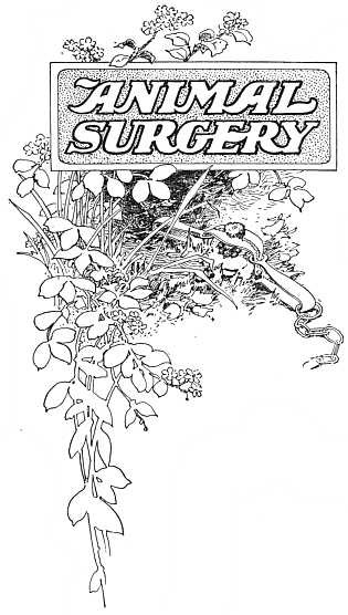 The most elemental kind of surgery is that which amputates a leg when it is broken, not always or often, but only when the wound festers from decay or fly-bite and so endangers the whole body. Probably the best illustration of this is found in the coon, who has a score of traits that place him very high among intelligent animals. When a coon's foot is shattered by a bullet he will cut it off promptly and wash the stump in running water, partly to reduce the inflammation and partly, no doubt, to make it perfectly clean. As it heals he uses his tongue on the wound freely, as a dog does, to cleanse it perhaps, and by the soft massage of his tongue to reduce the swelling and allay the pain.
