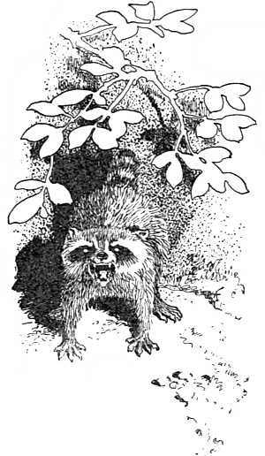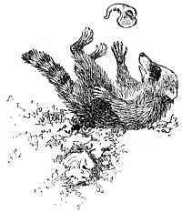 There is another curious habit of the coon which distinguishes him from the bear and from all other animals. That is, his habit of washing, or rather of sousing, everything he catches in water. No matter what he finds to eat,—mice, chickens, roots, grubs, fruit—everything, in fact, but fish,—he will take it to water, if he be anywhere near a pond or brook, and souse it thoroughly before eating. Why he does this is largely a matter of guesswork. It is not to clean it, for much of it is already clean; not to soften it, for clams are soft enough as they are, and his jaws are powerful enough to crush the hardest shells, yet he souses them just the same before eating. Possibly it is to give things the watery taste of fish, of which he is very fond; more probably it is a relic, like the dog's turning around before he lies down, or like the unnecessary migration of most birds, the inheritance from some forgotten ancestor that had a reason for the habit, and that lived on the earth long, long years before there was any man to watch him or to wonder why he did it.