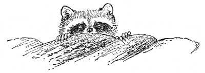 Fortunately such troublous times are rare in Mooweesuk's life, and the wilderness coon knows little about them. His life from beginning to end is generally a peaceable one, full of good things to eat, and of sleep and play and a growing knowledge of the woods. He is born in the spring, a wee, blind, hairless little fellow, like a mole or a bear cub. As he grows he climbs to the entrance to his den, and will sit there as at a window for hours at a time, just his nose and eye visible, looking out on the new, bright, rustling world of woods, and blinking sleepily in the flickering sunshine. Then come the long excursions with his mother, at first by day when savage beasts are quiet, then at twilight, and then at last the long night rambles, in which, following his leader, he learns a hundred things that a coon must know: to follow the same paths till he comprehends the woods; to poke his inquisitive nose into every crack and cranny, for the best morsels on his bill of fare hide themselves in such places; to sleep for a little nap when he is tired, resting on his forehead so as to hide his brightly marked face and make himself inconspicuous, like a rock or a lichen-covered stump; to leap down from the tallest tree without hurting himself; and when he uses a den in the earth or rocks, to have an exit some distance away from the entrance, and never under any circumstances to enter his den save by his front door. There is great wisdom in this last teaching. When a dog finds a hole with a trail that always leads out of it he goes away, knowing it is of no use to bark there; but when he finds an opening into which a trail is leading, he thinks of course that his game is inside, and proceeds to howl and to dig without ever a thought in his foolish head that there may be another way out. Meanwhile, as he digs and raises an unpardonable row in the quiet woods, Mooweesuk will either wait just inside the entrance till she gets a chance to nip the dog's nose or crush his paw, or else will slip quietly out of the back door with her little ones and take them off to a hollow tree where they can sleep in peace and have no fear till the dog goes away.