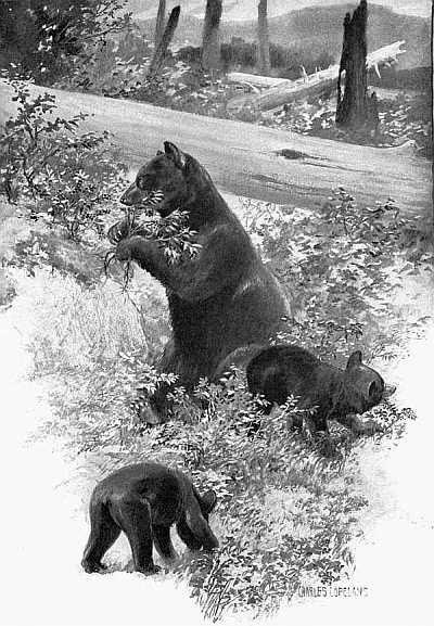To the hunter without a gun there is no close season on any game, and a doe and her fawns are better hunting than a ten-point buck. By land or water he is always ready; there are no labors for effects, except what he chooses to impose upon himself; no disappointments are possible, for whether his game be still or on the jump, shy as a wilderness raven or full of curiosity as a blue jay, he always finds something to stow away in his heart in the place where he keeps things that he loves to remember. All is fish that comes into his net, and everything is game that catches the glance of his eye in earth or air or water. Now it is the water-spiders—skaters the boys call them—that play a curious game among the grass stems, and that have more wonderful habits than the common balloon spiders which sometimes turned Jonathan Edwards' thoughts from the stern, unlovable God of his theology to the patient, care-taking Servant of the universe that some call Force, and others Law, and that one who knew Him called The Father, alike among the lilies of the field and in the cities of men. Now it is an otter and her cubs playing on the surface, that sink when they see you and suddenly come up near your canoe, like a log shot up on end, and with half their bodies out of water to see better say w-h-e-e-e-yew! like a baby seal to express their wonder at such a queer thing in the water. Now it is a mother loon taking her young on her back as they leave the eggs, and carrying them around the lake awhile to dry them thoroughly in the sun before she dives from under them and wets them for the first time; and you must follow a long while before you find out why. Now it is a bear and her cubs—I watched three of them for an hour or more, one afternoon, as they gathered blueberries. At first they champed them from the bushes, stems, leaves and all, just as they grew. Again, when they found a good bush, a little one with lots of berries, they would bite it off close to the ground, or tear it up by the roots, and then taking it by the stem with both paws would pull it through their mouths from one side to the other, stripping off every berry and throwing the useless bush away. Again they would strike the bushes with their paws, knocking off a shower of the ripest berries, and then scrape them all together very carefully into a pile and gobble them down at a single mouthful. And whenever, in wandering about after a good bush, one of the cubs spied the other busy at an unusually good find, it gave one a curious remembrance of his own boyhood to see the little fellow rush up whimpering to get his share before all the bushes should be stripped clean.