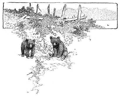 Could we have followed the family on this first night of their wanderings, before the raids began and the dogs had scattered them, we would have understood why Mooweesuk is called a brother to the bear. Running he steps on his toes like a dog; and anatomically, especially in the development of the skull and ear bones, he suggests the prehistoric ancestor of both dog and wolf; but otherwise he is a pocket-edition of Mooween in all his habits. The mother always leads, like a bear, and the little ones follow in single file, noting everything that the mother calls attention to. They sit on their haunches and walk flat-footed, like a bear, leaving a track from their hind feet like that of a dwarf baby. Everything eatable in the woods ministers to their hunger, as it does to that of the greedy prowler in the black coat. Now they stir up an ant's nest; now they grub into a rotten log for worms and beetles. If they can find sweet sap, or a bit of molasses in an old camp, they dip their paws in it and then lick them clean, as Mooween does. They hunt now for wintergreen berries, and now for a woodmouse. They find a shallow place in the brook when the suckers are running and wait there till the big fish go by, when they flip them out with their paws and scramble after them. From this fishing they turn to lush water-grass, or to digging frogs and turtles out of the mud; and the turtle's shell is cracked by dropping a stone upon it. Now they steal into the coop and scuttle away with a chicken; and after eating it they come back to the garden to crack a pumpkin open and make a dessert of the seeds. Now they see a muskrat swimming by in the pond with a mussel in his mouth, and they follow after him along the bank; for Musquash has a curious habit of eating in regular places—a flat rock, a stranded log, a certain tussock from which he has cut away the grass—and will often gather half a dozen or more clams and mussels before he sits down to dine. Mooweesuk watches till he finds the place; then, while Musquash is gone away after more clams, he will run off with all that he finds on the dining table. A score of times, on the ponds and streams, I have read the record of this little comedy. You can always tell the place where Musquash eats by the pile of mussel shells in the water below it; and sometimes you will find Mooweesuk's track stealing down to the place, and if you follow it you will find where he cracked the clams that Musquash had gathered.
