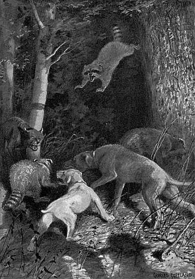 This is not from fear, for no animal, except perhaps the wolverine—who is a terrible beast—is more careless of danger or faces it with such coolness and courage when it appears. Of a dog or two he takes little heed. If he hear them on his trail, he generally climbs a tree to get out of the way; for your dog, unlike his wild brother, the wolf, is a meddlesome fellow and must needs be worrying everything; and Mooweesuk, like most other wild creatures, loves peace, hunts only when hungry, and would always prefer to avoid a row if possible. When caught on the ground, or cornered, or roused to action by a sudden attack, he backs up against the nearest tree or stone to keep his enemies from getting at him from behind, and then fights till he is dead or till none of his enemies are left to bother him, when he goes quietly on his way again. No matter how great the odds or how terribly he is punished, I have never seen a coon lose his nerve or turn his back to run away. If the dogs be many and he is near a pond or river, he will lead them into deep water, where he is at home, and then swimming rapidly in circles will close with them one by one and put them out of the fight most effectively. His method here seldom varies. He will whirl in suddenly on the dog that he has singled out, grip him about the neck with one arm, saw away at his head with his powerful teeth, at the same time slashing him across the eyes with his free claws, and then pile his weight on the dog's head to sink him under and drown all the rest of the fight out of him. That is generally enough for one dog; and Mooweesuk, without a scratch and with his temper cool as ice, will whirl like a flash upon his next victim.