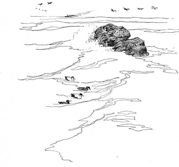 I noticed another curious thing while watching them and hoping that by some chance I might see one caught by a mussel. When a flock was passing high overhead, any sudden noise—a shout, or the near report of a gun—would make the whole flock swoop down like a flash close to the water. Plover have the same habit when they first arrive from Labrador, but I have hunted in vain for any satisfactory explanation of the thing.