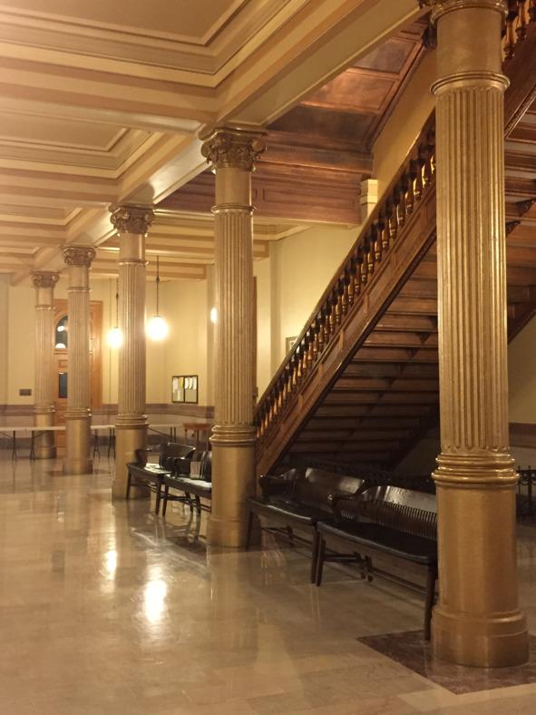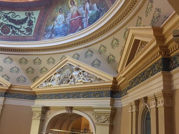 Мы поднялись наверх и долго рассматривали сверху атриум капитолия с его расписным потолком. Росписи были сделаны в античном стиле с фигурами разных девушек, олицетворявших разные сферы истории и культуры штата Канзас.