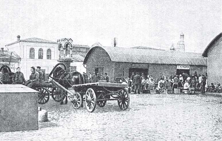К востоку от механического завода находился особняк сахарозаводчика Харитоненко с готическими интерьерами Федора Шехтеля и большой галереей русского искусства, а между заводом и Канавой пролегало собственно Болото – большая площадь, застроенная длинными каменными амбарами с сотнями лотков и лавок. В конце лета пространство между амбарами превращалось в гигантский фруктово-ягодный рынок. Каждый вечер перекупщики собирались в чайной Афанасьева, чтобы договориться о ценах. Около двух часов ночи они выходили к подъезжавшим крестьянам и «неспешно ходили вдоль линии возов, привычно поглядывая на ягодное изобилие. Выбрав то, что нужно, они называли цену и, если крестьянин начинал возражать, с деланным безразличьем отходили в сторону, спокойно закуривали папироску». Начинался торг. По словам репортера «Московского листка», «цифры, божба и ругань, клятвы и остроты – все это перемешивается, подхватывается и разносится по площади». На рассвете крестьяне разъезжались, начиналась торговля, и, «как по волшебству, все разом оживало, становилось красивым и веселым». Выбор был столь велик, «что можно было подивиться объему и аппетиту московского чрева, проглатывающего ежедневно эти дары Болота, – так, между прочим, как лакомство и пустую забаву»[16].