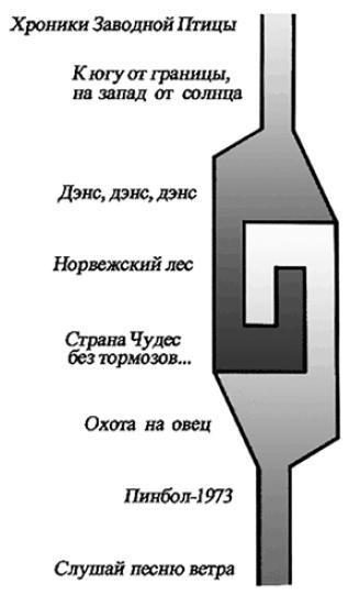 Начало пути – период «городской повести», где главный герой осознаёт, что чем дальше, тем больше «теряет себя» (на схеме: тень «собственного я» постепенно бледнеет). Далее, в «Охоте на овец», он отправляется на поиски «того, что потерял». Но к концу романа понимает, что остался с пустыми руками, – и замыкается в своём внутреннем мире. Там, в «запертом колодце подсознания», его эго перерождается. В «Стране Чудес» оно «стучится изнутри», затем отделяется от своего кокона-героя и постепенно, по двусоставной сюжетной спирали (реальный «я» – ирреальный «я», «этот» свет – «тот» свет) выбирается «наружу», обратно в «этот безумный мир». «Городская повесть» плавно трансформируется в «роман ужасов», а депрессивные самокопания героя уступают место описаниям окружающего мира в самых жестоких его, мира, проявлениях. Однако уже в «Дэнсе» внешний мир приобретает замкнуто-детерминированные, «матрицеобразные» формы. Герой снова хочет убежать из захлопывающейся реальности – и в очередной раз переродиться. Уже в «Юге» и «Хрониках» внешний мир всё сильнее размывается, эта реальность вокруг героя окончательно пропадает, а ей на смену приходит «новая ирреальность» – мир, созданный лишь его собственными волей и воображением.