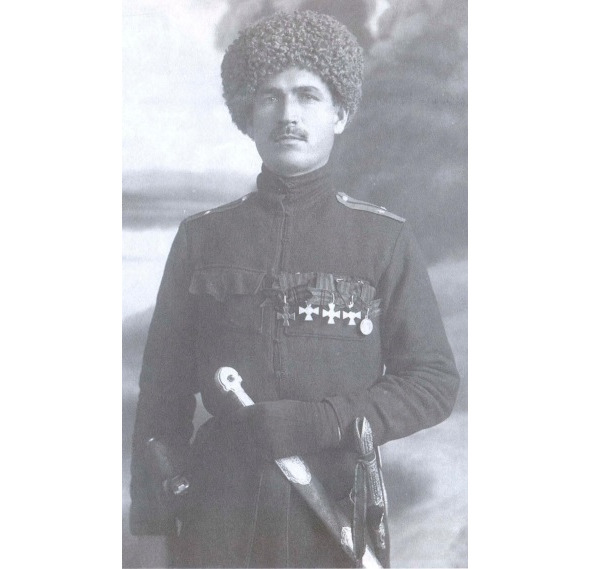 5623. КУДИНОВ Павел Назарович (Казак станицы Вешенской, х. Дударевский, ОВД). — 12 Донской каз. полк, мл. урядник. На военной службе с декабря 1912 года в 12 Донском казачьем полку. В 1913 году окончил учебную команду. В 1914 году мл. урядник. Подхорунжий, в 1916 году закончил Иркутскую школу прапорщиков. В Гражданскую войну в Донской армии. В!918 году в 32 Вёшенском полку, начальник пулемётной команды. 2 июня 1918 года ранен разрывной пулей в левую руку. С февраля по 24 мая руководил военными действиями Вёшенского восстания. Один из прототипов Григория Мелехова из романа М. Шолохова «Тихий Дон». Произведён в есаулы 12 апреля 1919 года, минуя чин. В июле 1919 года командир отряда, затем казачьего полка. В Донской армии в 3 Донском запасном полку в 1920 году. С весны 1920 года в Донском офицерском резерве. Полковник. В 1920 году в составе 3 дивизии эвакуировался в Константинополь. Работал на цементном заводе. В 1922 году переехал в Болгарию в город Князь-Александрово. С 1926 по 1934 год занимался свиноводством и фотографией. Там же, по некоторым данным, стал сотрудничать с ОГПУ и работать на советскую разведку. В ноябре 1944 года арестован СМЕРШ. В обвинительном заключении сказано: «Проживая после ранения в боях с Красной Армией в станице Вёшенской, при восстановлении там советской власти возглавил восстание среди казачества и создал 5 дивизий из числа повстанцев, в течении 3 месяцев руководил вооруженной борьбой против Красной армии», а так же находясь в Болгарии в 1935 году, по личной инициативе создал в г. Софии антисоветскую националистическую организацию. «Приговорён по ст. 58—4 и 58—11 УК РСФСР к 10 годам ИТЛ. Наказание отбывал в Озёрном лагере №7 МВД СССР. 22 октября 1951 года этапирован в Ростовскую тюрьму, где пробыл до августа 1953 года. Освобождён в 1955 году. Покончил жизнь самоубийством бросившись под поезд 19 октября 1967 года. Награжден Георгиевским крестом 1 ст. №5623, от Имени Его Императорского Величества Государя Императора, Его Императорским Высочеством Великим Князем Георгием Михайловичем за отличные подвиги мужества и храбрости, проявленные в боях с австро-германцами в 1914–1915 гг. Приказ по 11 кавалерийской дивизии за №119 от 30 июля 1915 года. Награждён ГК 2 ст. № …: «19 января 1915 г. утром вызвался охотником на разведку высоты 578, что южнее д. Зоколе и выяснил местонахождение пулемётов противника и этим спас сотню от лишних жертв, а перед этим было передано по телефону, что высота свободна.» Приказ 8 армейского корпуса за №321 от 1915 года. Награждён ГК. 3 ст. №24713: «В ночь с 20 на 21 декабря 1914 г., будучи старшим на наблюдательном посту на высоте 479, что северо-восточнее Модиева, захватил австрийский патруль, силою в 5 человек.» Награждён ГК. 4 ст.- «В начале декабря 1914 г., находясь на наблюдательном посту в лощине, донёс о нахождении роты противника в ограде костёла и, несмотря на большую опасность, продолжал наблюдать.» Награждён Георгиевскими медалями 3 и 4 ст. Награждён орденом Св. Станислава 3 ст. с мечами и бантом. Приказ за №1339 от 24 октября 1918 года.