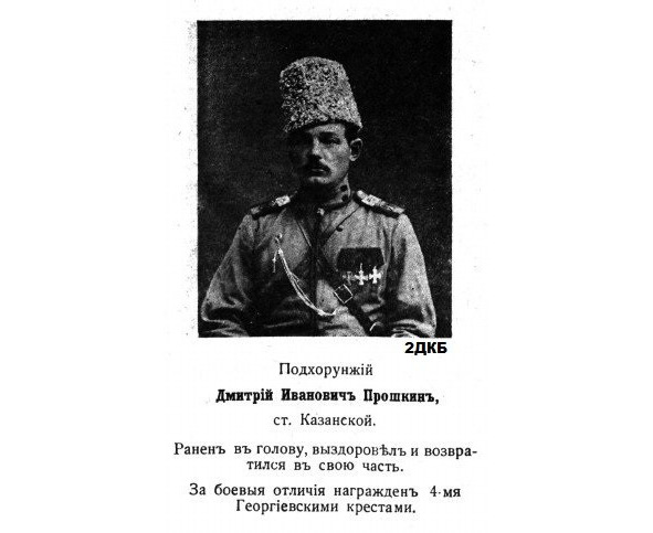 5921. ПРОШКИН Дмитрий Иванович (Казак станицы Казанской, ОВД) — 2 Донская каз. батарея, подхорунжий. Награжден Георгиевским крестом 1 ст. №5921, от Имени Государя Императора, Его Императорским Высочеством Великим Князем Георгием Михайловичем, за то, что 3.12.1914, где, будучи ранен, остался в строю до конца боя. В 1917 году «за боевые отличия» произведён в прапорщики. Был ранен в голову, выздоровел и возвратился в свою часть. Служил в 3-м Донском артдивизионе. Награждён ГК 2 ст. №57: «За то, что под сильнейшим огнем противника выказал выдающееся самоотвержение, спокойствие и храбрость при работе на батарее, чем служил примером для остальных и содействовал успеху батареи при уничтожении неприятельской батареи». Награждён ГК 3 ст. №581: «За самоотверженную работу и спокойствие во время боя, чем ободрял остальных и содействовал успеху действий батареи». Награждён ГК 4 ст. №25232: «За то, что личным мужеством и храбростью служил примером и воодушевлял остальных». Имеет Георгиевские кресты [II-57, III-581, IV-25232] *
