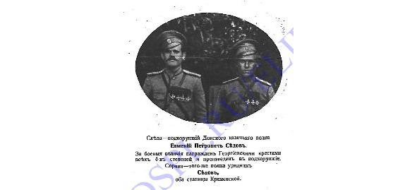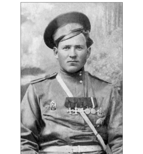 5774 ЕГОРОВ Емельян Иванович (Казак хутора Мартыновского станицы Дурновской, ОВД). — 13 Донской каз. генерал-фельдмаршала князя Кутузова-Смоленского полк, вахмистр. До войны около года проучился в Новочеркасском казачьем училище, был отчислен. В совершенстве овладел навыками фехтования. В гражданскую войну воевал в Донской армии. Перешел к красным. Командовал полком (?). Недовольный снова ушел к Белым. Попал в плен. Убит на допросе недалеко от станицы Урюпинской. Тело забрали родственники. Похоронен в ограде Михайловской церкви в Мартыновском хуторе (сейчас пустырь севернее начальной общеобразовательной школы х. Мартыновского). Награждён Георгиевским крестом 1 ст. №5774: «Награжден от Имени Государя Императора, Его Императорским Высочеством Великим Князем Георгием Михайловичем, за боевые отличия против неприятеля в течение войны 1914–1915 гг». Награждён ГК 2 ст. №6980: «За то, что при атаке противника 29.04.1915 у д. Онут, захватил пулемет». Награждён ГК 3 ст. №24166: «За то, что в бою 29.04.1915, когда противник был выбит из д. Онут и засел в окопах к западу от нее, вызвался охотником, под сильным огнем, частью ручными гранатами, а частью шашкой и ножницами, порубил и повалил проволочные заграждения и тем дал свободный проход нашим атакующим сотням». Награждён ГК 4 ст. №258551: «За то, что в бою 17.03.1915 у д. Рухотин, будучи начальником разъезда, выбил противника из занимаемого им укрепленного пункта». Награждён 3 Георгиевскими медалями. ГМ 4 ст. №329159: «25 апреля 1915 года при разведке в конном строю с беззаветной удалью подскакал к окопам противника и определил его силы. Имеет Георгиевские кресты [II-6980, III-24166, IV-258551] *