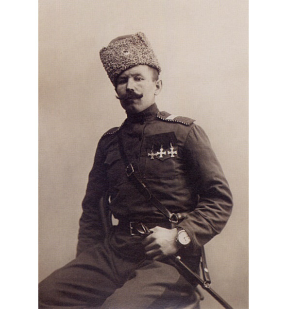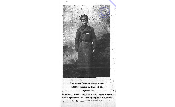 5814. ПОПОВ Дмитрий Лазаревич (Донского войска область, Хоперский округ, станица Аннинская) — 1 Донской казачий арт. дивизион, 6 Донская батарея, ст. урядник. Подхорунжий. В Граждвнскую войну в Донской армии. Хорунжий со старшинством с 27 ноября 1918 года. С весны 1920 в резерве Донской артиллерии. /14–88; 361–67/. Награжден Георгиевским крестом 1 ст. №5814, от Имени Государя Императора, Его Императорским Высочеством Великим Князем Георгием Михайловичем, за боевые отличия против неприятеля в течение войны 1914–1915 гг. Награждён ГК 2 ст. №7008: «За то, что 26.04.1915, когда командир батареи находился на наблюдательном пункте конного дивизиона, который не был связан с батареей, по личному желанию стал передатчиком между конно-горным дивизионом и батареей, несмотря на то, что место обстреливалось сильным шрапнельным и фугасным огнем тяжелой артиллерии. В это время батарея вела стрельбу по неприятельской батарее, результатом чего было прекращение огня неприятельской батареи». Награждён ГК 3 ст. №40641: «За мужество и храбрость, проявленные в боях с неприятелем с 10-го по 13.03.1915 у г. Залещики». Награждён ГК 4 ст. №79705: «Награжден по Высочайшему повеление Генерал-Адъютантом князем Васильчиковым за отличия в делах против неприятеля». Имеет Георгиевские кресты [II-7008, III-40641, IV-79705] *