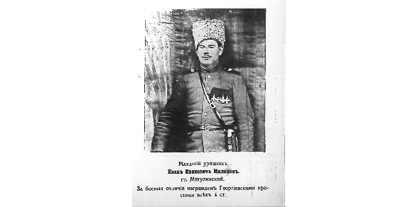5864. МАЛИКОВ Иван — 2 Сунженско-Владикавказский каз. полк, ст. урядник. Произведен в подхорунжие (П. 30 арм. корп. №118, от 03.09.15 г.) Награжден Георгиевским крестом 1 ст. №5864, 5.08.1915 от Имени Государя Императора, Его Императорским Высочеством Великим Князем Георгием Михайловичем по случаю годовщины войны. Награждён Георгиевским крестом 1 ст. №3945, за то, что 29.01.1915, в разъезде на Пистынь, наткнулся на 60 человек австрийских улан, которые в карьер бросились на казаков, отстреливаясь на ходу, начал отступать и навел их на нашу засаду, которой и были захвачены в плен с лошадьми и со снаряжением. Награждён ГК 2 ст. №2505: «За отвагу и беззаветную удаль, как во время конной атаки, так и во время выбивания неприятеля (соколов) из домов в бою 11.10.1914 у д. Пасечная». Награждён ГК №185060: «За оказанные им подвиги храбрости и мужества в бою с австрийцами 16.09.1914 у д. Яблоница, когда будучи в цепи под сильным ружейным огнем противника, первый бросился с шашкой на окопы противника, выбил его и захватил один пулемет и 12 человек пленных». Имеет Георгиевские кресты [I-3945, II-2505, IV-185060] *