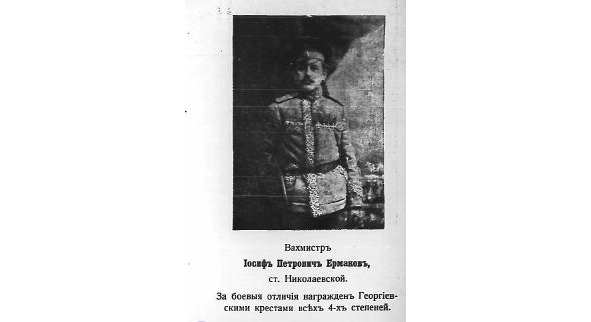 13729. ЕМАНОВ Павел Васильевич (Казак станицы Екатериноградской, ТКВ). — 2 Горско-Моздокский каз. полк, урядник. В Гражданскую войну в РККА. В январе 1926 г. избран в члены Екатериноградского станичного совета. Награждён Георгиевским крестом 1 ст. №13729, за то, что 24.06.1916, атакуя выс. «1602», первым ворвался на позицию противника, своей храбростью увлекая людей, и захватил в плен 1 офицера и 8 нижних чинов. Награждён ГК 2 ст. №21082: «За то, что в бою 30.04.1915 у с. Жукоцин, в конной атаке, первым бросился на противника и, пройдя первые ряды неприятельских окопов, под сильным ружейным и пулеметным огнем противника, ворвался в деревню, захватив пулеметы и 70 человек пленных». Награждён ГК 3 ст. №44867: Вместо креста 4 ст. №185407. Награждён. ГК 4 ст. №192500: «За то, что 14.09.1914, вызвавшись охотником, занял окраину села Надворна, вытеснил противника из селения». Награждён ГК 4 ст. №185407: «За храбрость и мужество, проявленные в боях 16-го и 17.10.1914 у м. Надворная». Из приказа №63 по 2-му Горско-Моздокскому полку №111: «24 апреля 1915 г. Приказом 30-му корпусу 17 апреля 1915 г. №93 нижепоименованные нижние чины командуемого мною полка за оказанные ими подвиги храбрости и мужества в боях с австрийцами во время похода в Карпаты, награждены командующим 8-й армией Георгиевскими медалями 4-й степени»: Приказный Павел Еманов — №194595 (Ст. Екатериноградская). Командир полка полковник Колесников.*