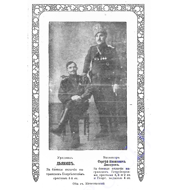 5897. МАЛЕЙЧЕНКО Николай Петрович (Терская область, Пятигорский отдел, стан. Лысогорской) — 1 Волгский каз. Его Императорского Высочества Наследника Цесаревича полк, 3 сотня, ст. урядник. Пожалован Георгиевским крестом 1 ст. №5897, от Имени Его Императорского Величества в память годовщины войны, как особо отличившийся в настоящую войну своей храбростью, мужеством и лихостью. Награждён ГК 3 ст. №72917: «За отличия, оказанные в делах против неприятеля». Награждён ГК 4 ст. №221553: «Награжден 20 (28).04.1915 Командующим 8-й армией Генерал-Адъютантом Брусиловым за проявленные им выдающиеся подвиги мужества и храбрости в боях с неприятелем». Имеет Георгиевские кресты [III-72917, IV-221553] *
