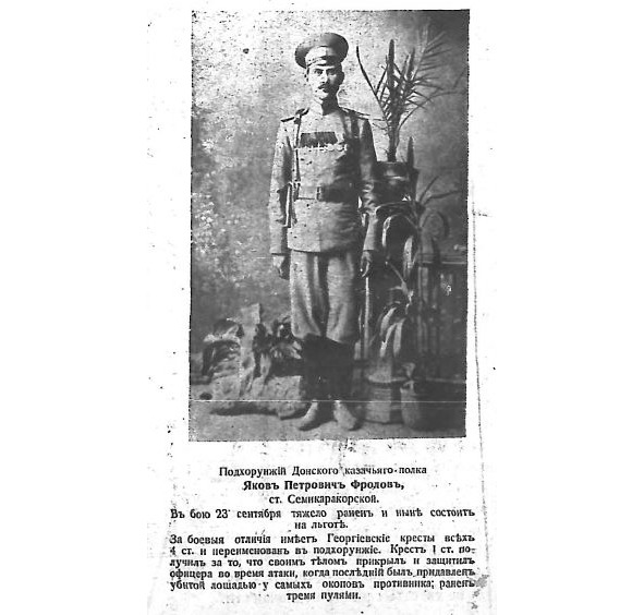 14937. ФРОЛОВ Федор Исидорович — 9 Донской каз. генерал-адъютанта графа Орлова-Денисова полк, ст. урядник. Награждён Георгиевским крестом 1 ст. №14937, за то, что 31.10.1916, во время пешей атаки на выс. «1548», несмотря на губительный огонь пулеметов и ружейный, шел впереди всех и увлекал за собой товарищей, чем заставил противника бросить окоп. Награждён ГК 2 ст. №31139 ФРОЛОВ Федор Исидорович — 9 Донской каз. генерал-адъютанта графа Орлова-Денисова полк, ст. урядник. Вместо креста 4 ст. №168138. Награждён ГК 3 ст. №39349: «За преодоление проволочного заграждения, овладение тройным рядом сильных окопов у д. Баламутовка 27.04.1915 и энергичное преследование разбитого противника до д. д. Черный-Поток и Онут». Награждён ГК 4 ст. №168138: «За отличие в боях с неприятелем с 24.02 по 2.03.1915 у д. Герасимов». Награждён ГК 4 ст. №164438: «За то, что 6.11.1914, в числе первых бросился в рукопашный бой, увлекая за собой других, и тем содействовал успеху боя». Имеет Георгиевские кресты [II-31139, III-39349, IV-164438] *