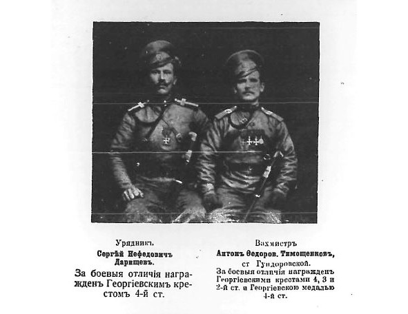 5850. СВЕТЛИЧНЫЙ Федор (Казак ст. Кахановской, ТКВ) — 2 Кизляро-Гребенский каз. полк, 2 сотня, ст. урядник. Награжден Георгиевским крестом 1 ст. №5850, 5.08.1915 от Имени Государя Императора, Его Императорским Высочеством Великим Князем Георгием Михайловичем по случаю годовщины войны. Награждён ГК 1 ст. №3942 вместо креста 3 ст. N 44786. Награждён ГК 2 ст. №21055: «За то, что в бою 30.04.1915 у с. Жукоцин, под ружейным и артиллерийским огнем противника, личным мужеством и храбростью, при атаке увлекал товарищей вперед, чем способствовал общему успеху». Награждён ГК 3 ст. №6961 Верховным Главнокомандующим за оказанные им подвиги храбрости и мужества в боях с австрийцами в Буковине. Награждён ГК 3 ст. №44786*: «За то, что в бою 16.12.1914 у д. Петроуц, находясь в составе взвода, атаковавшего противника, первым бросился на пехотную заставу, засевшую в окопе и примером отличной храбрости увлекал за собой остальных людей взвода, чем и способствовал взятию в плен всей заставы». Заменен на крест 1 ст. No 3942. Награждён ГК 4 ст. №26721: «За подвиги мужества и храбрости в бою 27-го и 28.08.1914 у д. д. Прзепозль и Незавиза». Имеет Георгиевские кресты [I-3942, II-21055, III-6961, IV-26721] *
