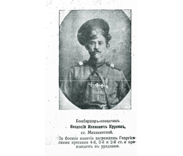 13740. КУРКИН Федосей Иванович (Казак станицы Митякинской, ОВД). — 3 Донской казачий арт. дивизион, 2 батарея, мл. урядник. Награждён Георгиевским крестом 1 ст. №13740, за то, что под сильным и действительным артиллерийским и ружейным огнем, отыскал скрытую неприятельскую батарею, наносившую вред нашим войскам, точно указал ее место, чем дал возможность привести ее к молчанию. Награждён ГК 2 ст. №5695: «За то, что, будучи разведчиком, с личной опасностью для себя, доставил важные сведения о противнике». Имеет Георгиевские кресты [II-5695] *