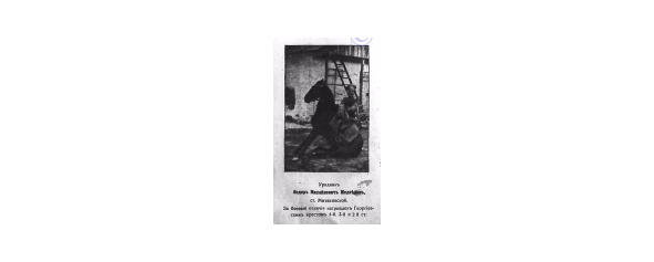 14044. ВЬЮРКОВ Петр Терентьевич — 1 Уральский каз. полк, урядник, вахмистр. За боевые отличия присвоен чин подхорунжего. Награждён Георгиевским крестом 1 ст. №14044, за отличие в бою 27.05.1916 у д. Порхово, где командуя взводом, выбил противника из окопов и захватил часть австрийцев в плен. Награждён ГК 2 ст. №40856: Вместо креста 2 степени №9654. Награждён ГК 2 ст. №9654: «За отличие в бою 5.07.1915». Награждён ГК 4 ст. №2502: «За то, что находясь во взводе, бывшим в распоряжении командира 2-й бригады 5-й пех. дивизии в бою под Равва-Русска, когда 19 пех. Костромской полк, оттеснив противника, продвинулся вперед к д. Погоржелиска и донес, что дальше идти не может, т.к. по направлению от д. Замек к д. Погоржелиска и вся долина обстреливалась сильнейшим артиллерийским огнем противника, то был выслан боевой разъезд из 3-х казаков под командой вахмистра Чистоблинникова, чтобы узнать — своя или неприятельская батарея стреляет из д. Замек, ибо было предположение, что стреляют слева части соседней дивизии, продвинувшейся вперед в этом направлении. Он, перепрыгнув через изгородь огородов с двумя другими казаками, был здесь обстрелян и на встречу им, кроме того, шел взвод кавалеристов. В это время казак Калистрат Попов был ранен, а так же и его лошадь, которая остановиласчь и Попов слез с нее. Видя это, он поймал бежавшую здесь лошадь урядника Фролова, подвел ее к Попову, помог сесть и обо ускакали». Имеет Георгиевские кресты II-40856, IV-2502] *