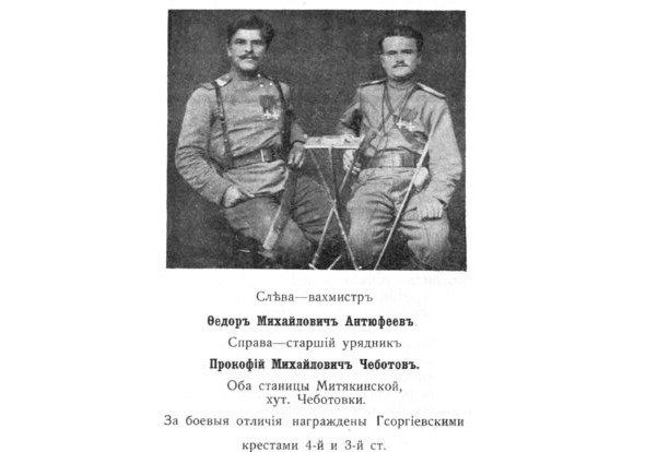 14944. ЧЕБОТОВ Прокофий Михайлович (Казак станицы Митякинской, х. Чеботовский. Сын хуторского атамана Чёботова Дмитрия). — 10 Донской каз. генерала Луковкина полк, 6 сотня, урядник, вахмистр. За боевые отличия произведён в подхорунжие. Воевал в Донской армии. Хорунжий. В Вооруженных силах Юга России. Взят в плен. С октября 1922 на особом учете в Донском ОВК. На 1923 на особом учете в ПВО. /7–47,150; 707–951/. Летом 1937 обвинялся в принадлежности к антисоветской организации. /361–23/ Из дела Рудакова №20274, НКВД 1937 г. Награждён Георгиевским крестом 1 ст. №14944, за то, что 30.10.1916, будучи взводным при своем взводе, при наступлении германцев на выс. «1537», отражал яростные атаки и, ободряя своих казаков, первым бросился в атаку, чем заставил неприятеля отступить. Награждён ГК 2 ст. №36020: «За отличия, оказанные в делах против неприятеля». Награждён ГК 3 ст. №39487: «За отличие в бою 17.03.1915 у д. Шиловцы». Награждён ГК 4 ст. №164458: «За то, что в бою 8.11.1914 у д. Сямошице, первым ворвался в занятую противником укрепленную деревню». Награждён Георгиевским крестом 4 ст. №258571. За отличие в бою 17.03.1915 у д. Рахотин (Рухотин).Имеет Георгиевские кресты [II-36020, III-39487, IV-164458] *