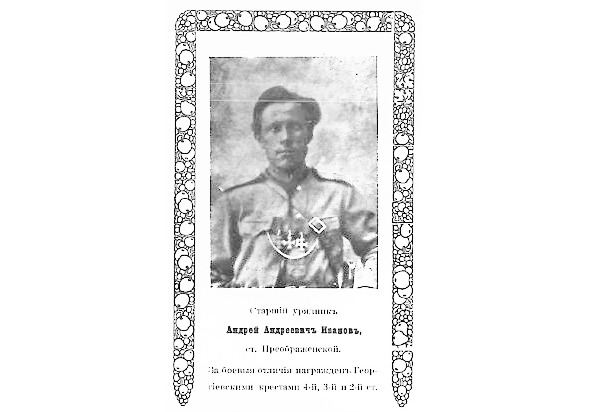 14945. ИВАНОВ Андрей Андреевич (Казак станицы Преображенской, ОВД). — 13 Донской каз. генерал-фельдмаршала князя Кутузова-Смоленского полк, ст. урядник. Награждён Георгиевским крестом 1 ст. №14945: «За то, что 25.10.1916, при атаке, храбро и смело шел вперед на окопы, первым прорезал проволочное заграждение и увлек за собой остальных». Награждён ГК 2 ст. №12634: «Награжден от Имени Государя Императора, Его Императорским Высочеством Великим Князем Георгием Михайловичем, за боевые отличия против неприятеля в течение войны 1914–1915 гг.». Награждён ГК 3 ст. №39180: «За то, что первый бросился (с Шелковниковым Филиппом, казаком станицы Преображенской), под сильным огнем противника, на проволочные заграждения по р. Онут и уничтожил их, чем дал возможность пройти нашим атакующим частям и выбить противника из д. Онут». Награждён ГК 4 ст. №121332: «За мужество и храбрость при переправе через реки Вислу и Сан и в боях на левом берегу р. Вислы». Имеет Георгиевские кресты [II-12634, III-39180, IV-121332] *