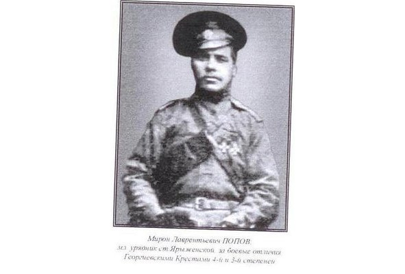 14946. ПОПОВ Мирон Лаврентьевич (Казак станицы Ярыженской, ОВД). — 13 Донской каз. генерал-фельдмаршала князя Кутузова-Смоленского полк, ст. урядник. Награждён Георгиевским крестом 1 ст. №14946, за то, что 29.10.1916, при обороне выс. «1482», в течение дня отбил 11 атак сильного противника и удержал за собой позицию. Награждён ГК 2 ст. №7775: Вместо креста 4 ст. №266715. Награждён ГК 3 ст. №39163: «За то, что при конной атаке противника в бою 27.04.1915, западнее д. Баламутовка, примером личной храбрости увлекал за собой товарищей, следствием чего было уничтожение более роты пехоты». Награждён ГК 4 ст. №168444: «За храбрость и мужество, проявленные в боях с неприятелем 10-го, 11-го и 12.03.1915 у г. Залещики». Награждён ГК 4 ст. №266715: «За то, что при ночной атаке противника 28.04.1915, бросился на противника в пики и шашки, увлекая за собой товарищей, и отразил противника, при рукопашной схватке первым ворвался в ряды противника, рубя направо и налево и увлекая за собой товарищей». Заменён на ГК 2 ст. №7775. Имеет Георгиевские кресты [II-7775, III-39163, IV-168444] *