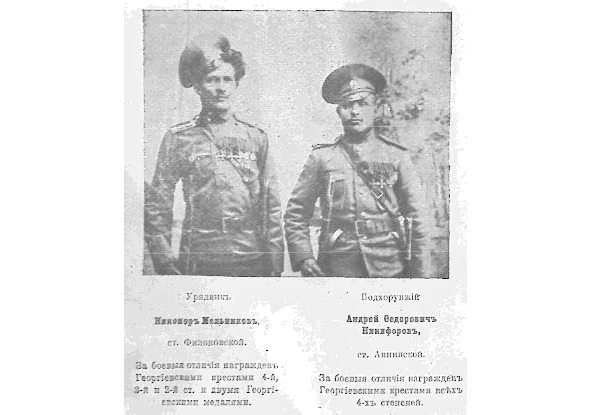 14045. НИЩЕВ Иван Харлампович — 1 Уральский каз. полк, 3 сотня, урядник, вахмистр. За боевые отличия произведён в чин подхорунжего. В Гражданскую войну в Уральской армии белых, прапорщик. Награждён Георгиевским крестом 1 ст. №14045, за то, что в конной атаке на пехоту противника 27.05.1916 у д. Порхово, примером личной храбрости увлек своих товарищей, чем содействовал успеху дела. Награждён ГК 4 ст. №533153: «За отличия в делах против неприятеля». *