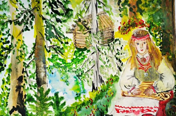Долго ли, коротко ли шла наша девица, про то нам не ведомо, да вот только лапти её поизносились, сарафан, за долгую дорогу, по обтрепался, да и запасы её съестные давно закончились. Повела её дорожка через лес. А там ягод видимо не видимо: и черника, и земляника просто сами в рот просятся. Вот так она ягодка за ягодкой, кустик за кустиком и забрела в самую чащу. Опомнилась, когда от деревьев вокруг темно стало. «Как же я теперь от сюда выбираться буду» — думает девица. Села на пенёк и стала думать, куда ей дальше идти. И вдруг между деревьев увидела она солнечный свет. Да и тропинка там еле заметная виднелась. Побежала Заряна по той тропинке и вышла на большую поляну.