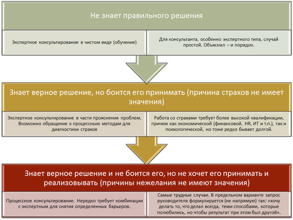 Однако же сравнение руководителя с пациентом не совсем корректно. «Больной» в медицине легко и просто может оказаться из разряда «рядовых необученных», в то время как руководитель предприятия нередко сам грамотный специалист, а даже если и не имеет соответствующего базового образования, то все равно знает о своем бизнесе как никто много.