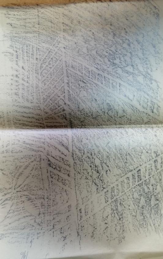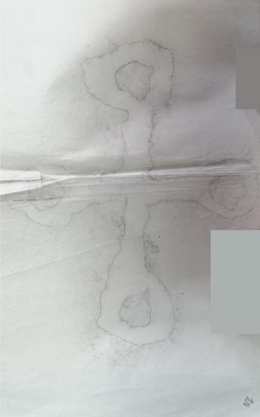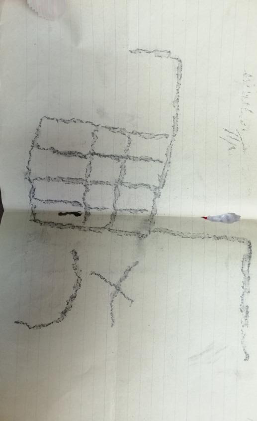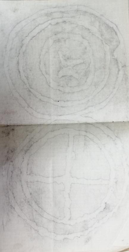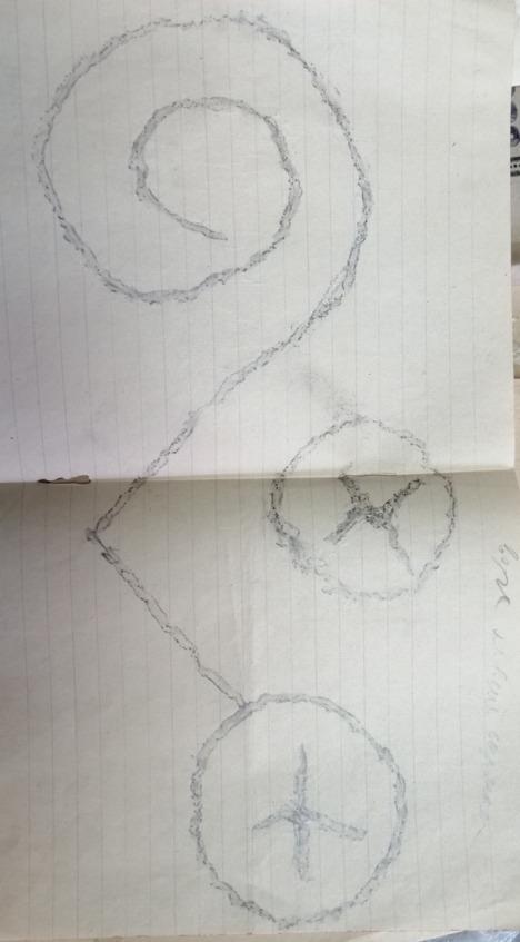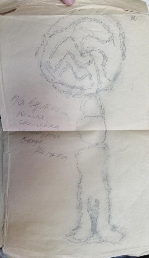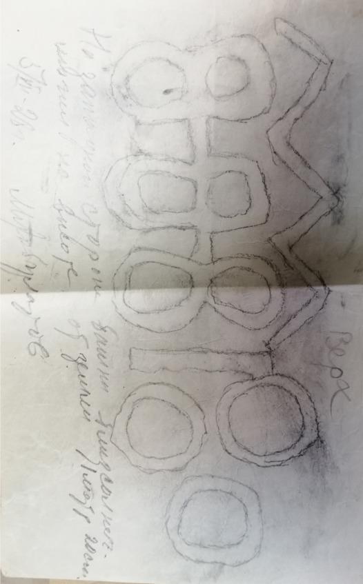 Поданный мне предмет был какой-то синий камушек формы четырехгранной усеченной пирамиды. Основание его имело в длину 1 ¾ см и в ширину 1 см; плоскость верхнего сечения была приблизительно втрое меньше. Сквозь тело камушка, параллельно длинной стороне основания, проходило круглое отверстие, служившее, вероятно, для продевания нитки. Интерес камушка сосредоточивался на его основании, на котором виден был какой-то не то выдавленный, не то вырезанный рисунок. Я стал внимательно рассматривать рисунок, стараясь разобрать его, но это мне удавалось плохо. Заметив мои усилия, Эльдар вытащил из своей папахи (шапки) какую-то грязную бумажку и сунул мне ее в руку.